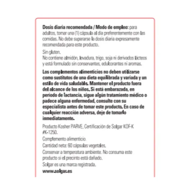 El arándano rojo natural Solgar no contiene sal, almidón, maíz, levadura, trigo, soja, gluten, derivados lácteos, conservantes, aromas artificiales, ni colorantes.