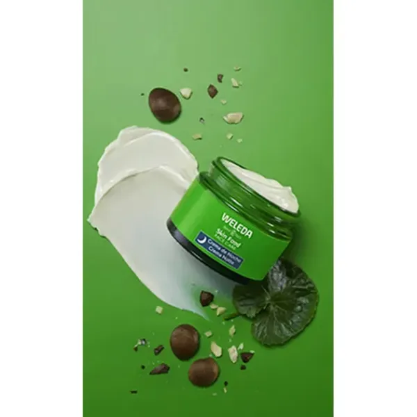 Nuestra Crema de Noche de la línea Skin Food combina extractos botánicos de pensamiento, caléndula y manzanilla orgánicas con centella, escualeno y aceite de sacha inchi orgánico.