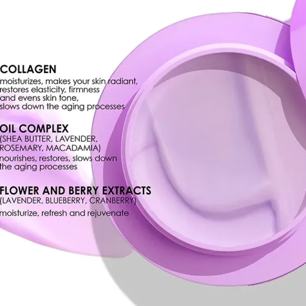 Ingredientes Activos: Colágeno eleva, combate arrugas; complejo de aceites nutre y suaviza.