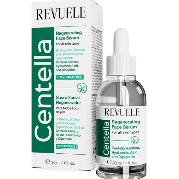 REVUELE CENTELLA REGENERING FACE SERUM es un cuidado facial diario ultra activo para fortalecer la piel para todo tipo de pieles con tez apagada, signos de fatiga y líneas finas. La fórmula rica en CICA (Centella Asiatica) y Ácido Hialurónico hidrata la piel en profundidad y potencia la función reparadora de la piel.