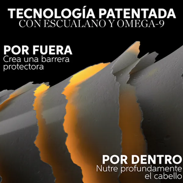 Enriquecido con escualano y omega-9, este sérum capilar ofrece protección contra los rayos UV y el calor (230°C/450°F), proporcionando 96 horas de control del encrespamiento y un brillo sedoso.