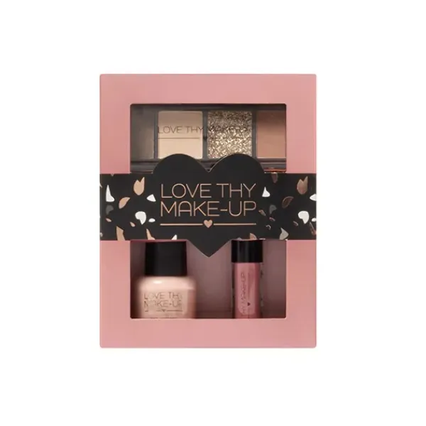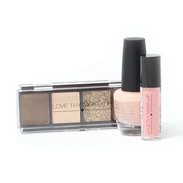 Set de maquillaje que incluye una paleta de sombras, esmalte de uñas en tono nude y labial glossy super hidratante.