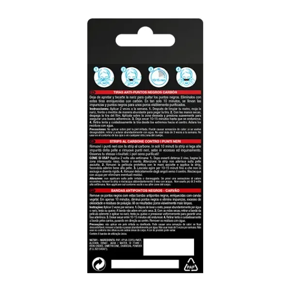 Las tiras Pure Active carbón enriquecidas con carbón vegetal, se llevan las impurezas y los puntos negros para unos poros visiblemente purificados.