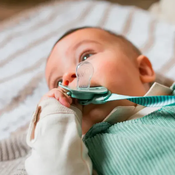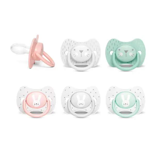 Chupete premium con tetina fisiológica silicona de forma plana y simétrica que queda siempre correctamente colocada en la boquita del bebé, ejerciendo la mínima presión sobre el paladar.