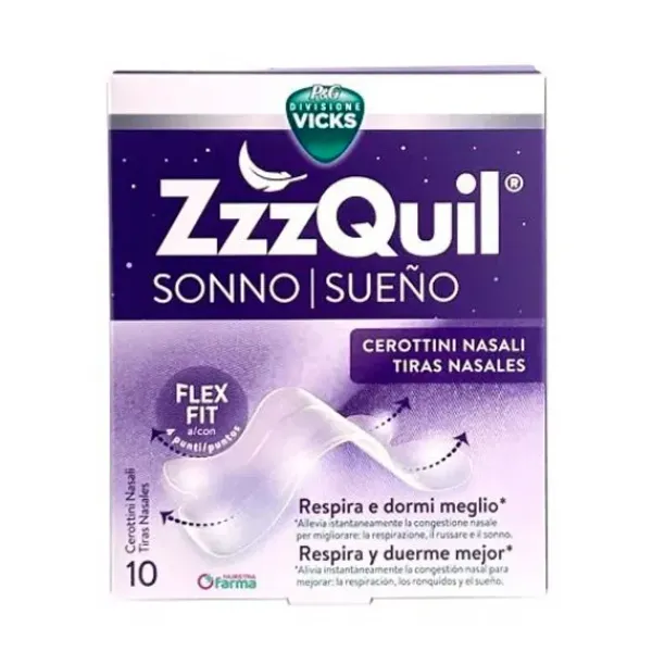 ZZZQUIL Sueño Tiras Nasales están diseñadas para mejorar eficazmente la respiración y promover el sueño reparador al reducir los ronquidos y aumentar el flujo de aire nasal.