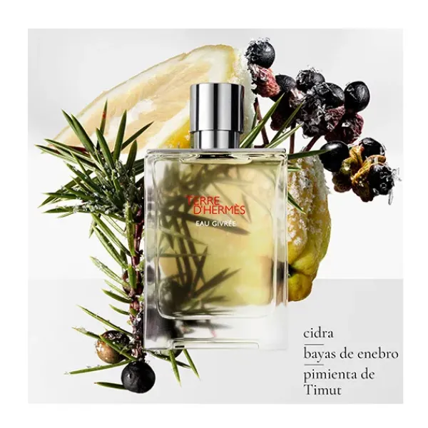 Creada por la perfumista de Hermès Christine Nagel, la fragancia combina el vigor de la cidra y el penetrante frescor de la baya de enebro con el poder de la pimienta de Timut. La sorprendente sensación de un soplo helado se combina con las generosas notas minerales y amaderadas típicas de Terre d’Hermès.