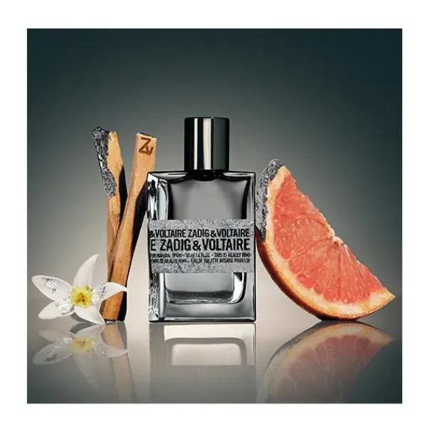 La intensa fragancia masculina de ZADIG&VOLTAIRE, This Is Really Him! es un perfume amaderado de color ámbar que ilumina las sombras de la noche parisina con su elegante aroma del día a la noche. En la parte superior, brillantes notas cítricas de pomelo luminoso y limón chispeante abren la fragancia con una explosión de frescura. El corazón del perfume luego revela el cautivador acorde metálico de flor de naranjo, antes de dar paso a las cálidas notas de acorde de palo santo y notas de maderas de ámbar para una estela de fragancia seductora.