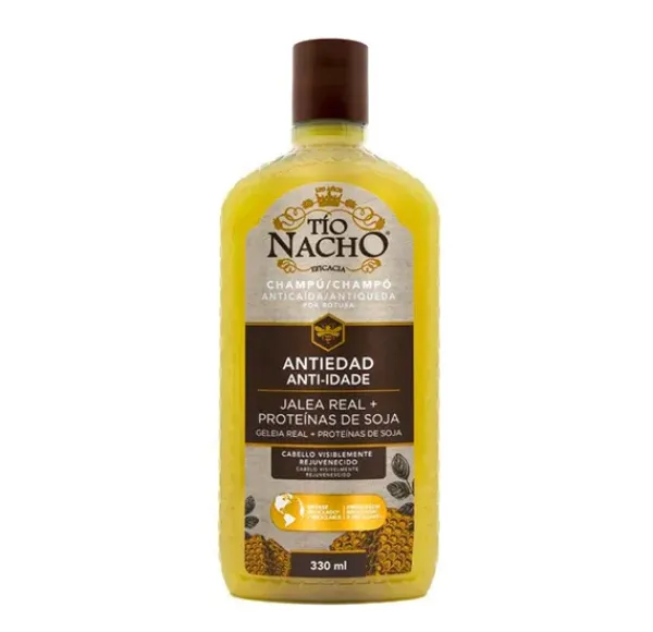 EVITA LA CAÍDA de cabello por quiebre con TÍO NACHO ANTIEDAD y aporta a tu cabello una apariencia MÁS JÓVEN, visiblemente más saludable y SUAVE. Con la eficacia de su ingrediente principal JALEA REAL y extractos de origen natural como, extracto de Germen de Trigo, Aloe Vera y Soja.