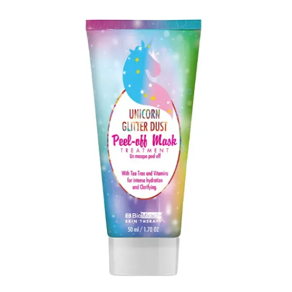 Mascarilla facial peel-off glitter con extracto de árbol de té y vitaminas para una hidratanción intensa.