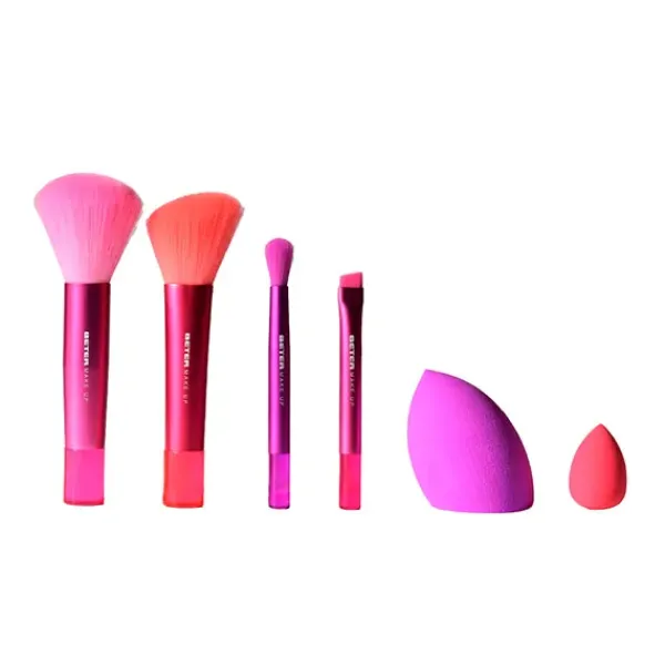 Contiene una esponja de maquillaje fluido, una esponja mini para corrector y cuatro brochas y pinceles de pelo sintético, los esenciales para conseguir cualquier look que te propongas con un resultado profesional.