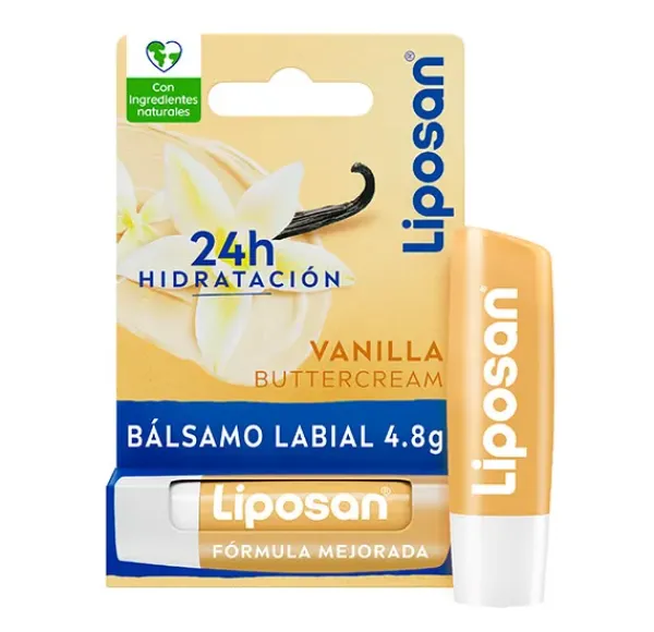 El bálsamo labial Liposan Vanilla Buttercream proporciona a tus labios un delicioso aroma a vainilla mientras los hidrata y los cuida. Su fórmula enriquecida con Manteca de Karité y aceites de origen natural enriquecidos con Vitaminas tiene una suave textura que se funde instantáneamente en tus labios y los mantiene hidratados durante 24 horas. Disfruta de unos labios deliciosamente suaves y con aspecto natural todo el día. ¡Listos para besar y con un aroma que te encantará! Compatibilidad con la piel comprobada dermatológicamente.