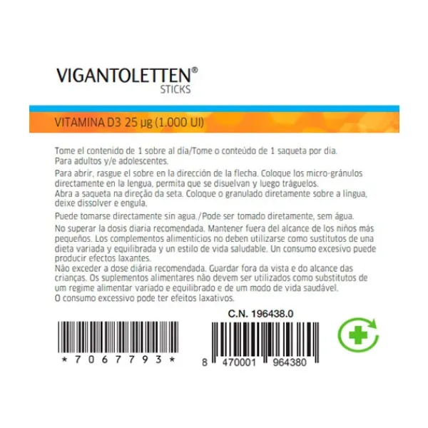 Vigantoletten Vitamina D3 viene en un formato de stick que aporta 25 mcg (1000 UI) de vitamina D3.