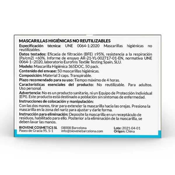 – Modelo: Mascarilla Higiénica 365DOC, 50 pack.