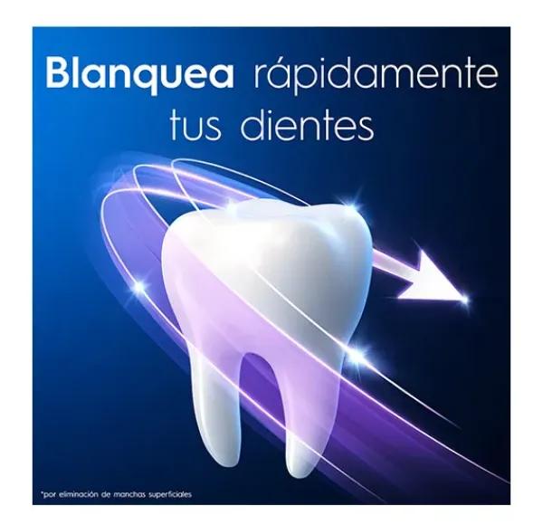 Blanquea eliminando las manchas superficiales desde el primer cepillado, las elimina hasta el 100% en 5 días y protege los dientes de ácidos y futuras manchas superficiales.
