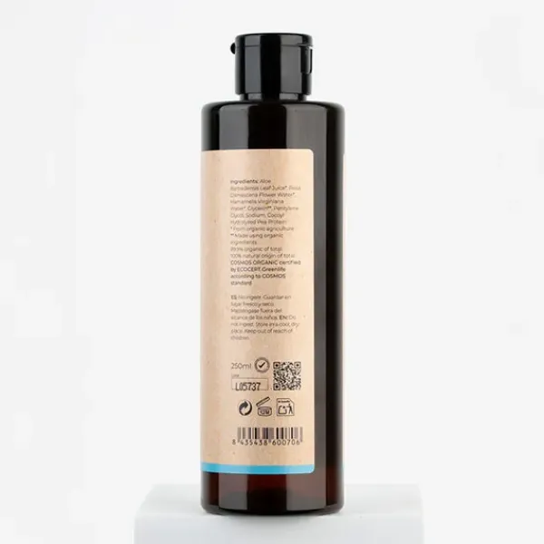 Un agua micelar diferente, a base de aloe vera, hidrolato de rosa y hamamelis que limpia y calma tu piel.