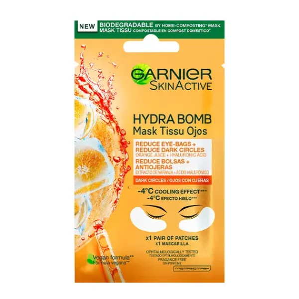 La Mascarilla de Tejido Anti-Fatiga contiene extracto de naranja y ácido hialurónico y está diseñadas para reducir bolsas y ojeras.