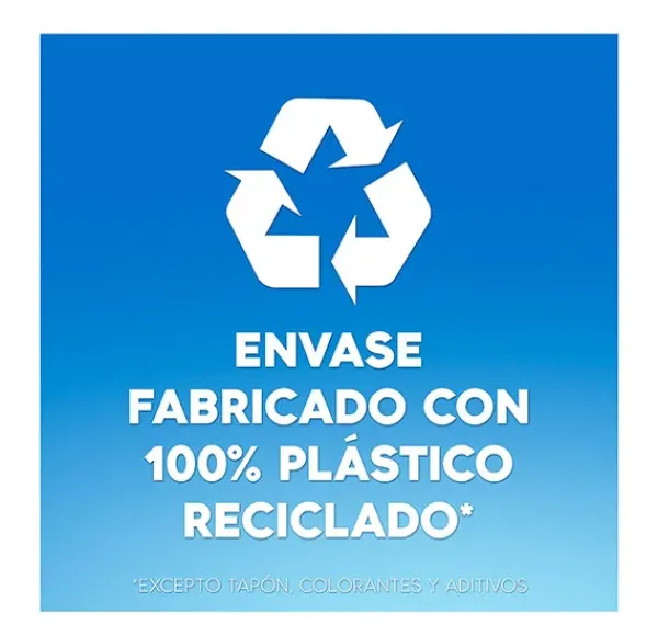 La botella está hecha con un 100 % de plástico reciclado y es reciclable.