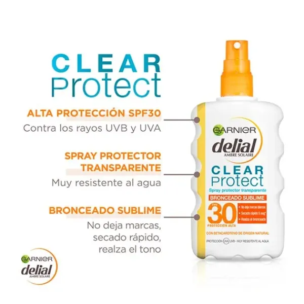 Delial Clear Protect Spray IP30 Ideal Bronze es un spray protector solar transparente que realza el bronceado.