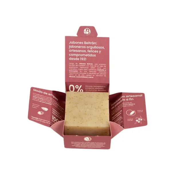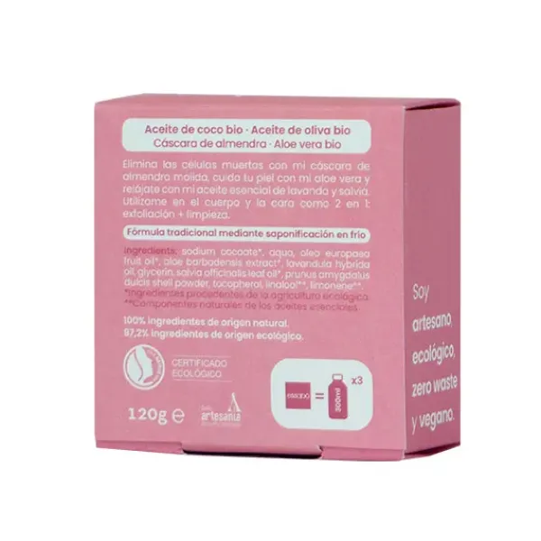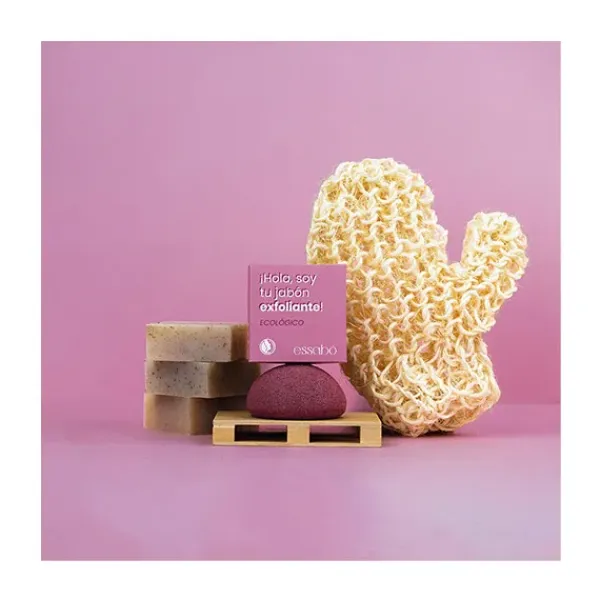 Essabó Exfoliante es un jabón de baño formulado para exfoliar naturalmente la piel, gracias a la cáscara de almendra molida y al aloe vera orgánico. Su base está elaborada con aceite de coco y con aceite de oliva ecológicos. Elaborado artesanalmente mediante saponificación tradicional en frío. Idóneo para todo tipo de pieles.