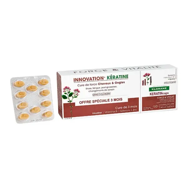 El complemento alimenticio KeratinCaps de Klorane es rico en micronutrientes esenciales que actúan desde el interior para mantener el cabello fuerte y sano.