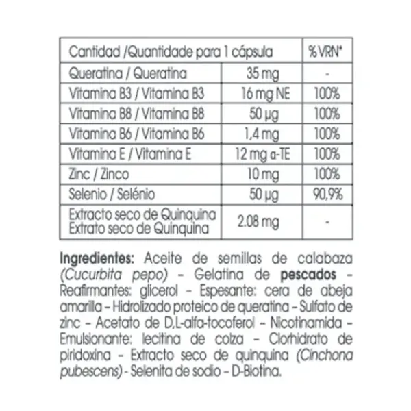 Las cápsulas contienen una fórmula a base de extracto de quinina, complejo de vitamina B, zinc, selenio y queratina para devolver la fuerza y la vitalidad al cabello estresado. Este aporte de micronutrientes fortalecedores revitaliza el cabello y fortalece el tallo piloso.