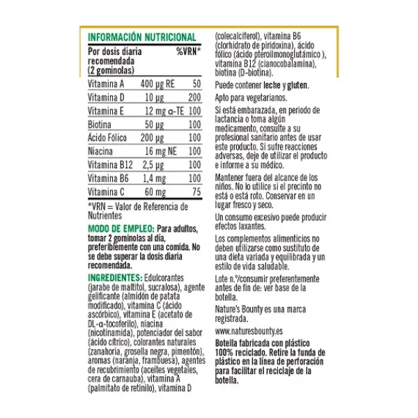El complemento alimenticio Multivitamínico Adultos Gummies con Vitamina C y D3 de Nature´s Bounty® contiene una mezcla de vitaminas para el apoyo del bienestar general, incluyendo vitamina D3, vitamina C y vitamina B.