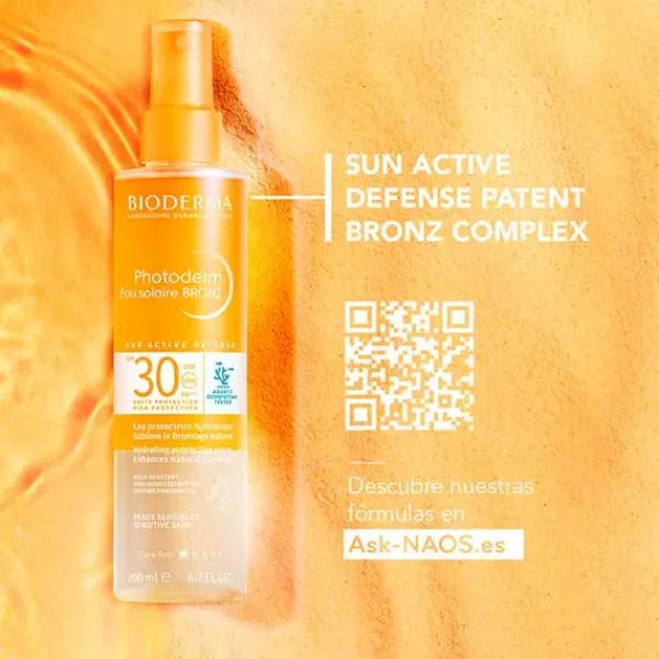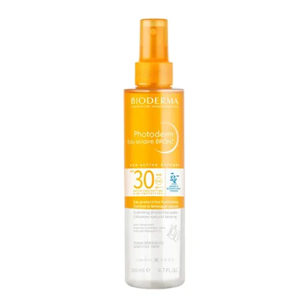 Agua solar bronceadora. Agua hidratante corporal que estimula el bronceado y protege la piel de los rayos solares. Con alta protección solar con SPF30.