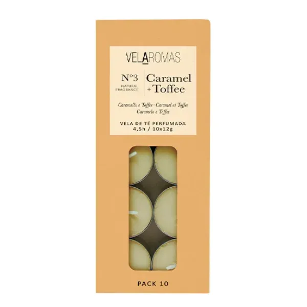 Pack de 10 minivelas con fragancia caramelo toffee.