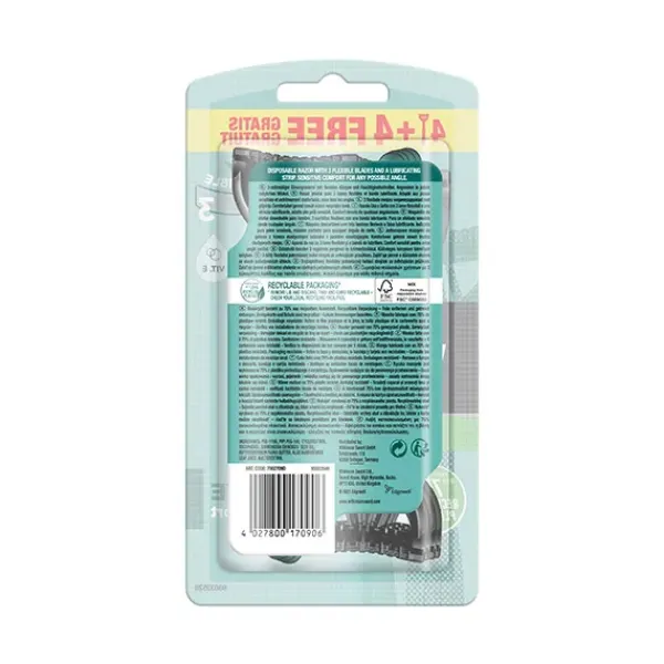 Maquinilla desechable para pieles sensibles con 3 hojas flexibles y banda lubricada con Aloe Vera y Vitamina E que protege la piel durante el afeitado.