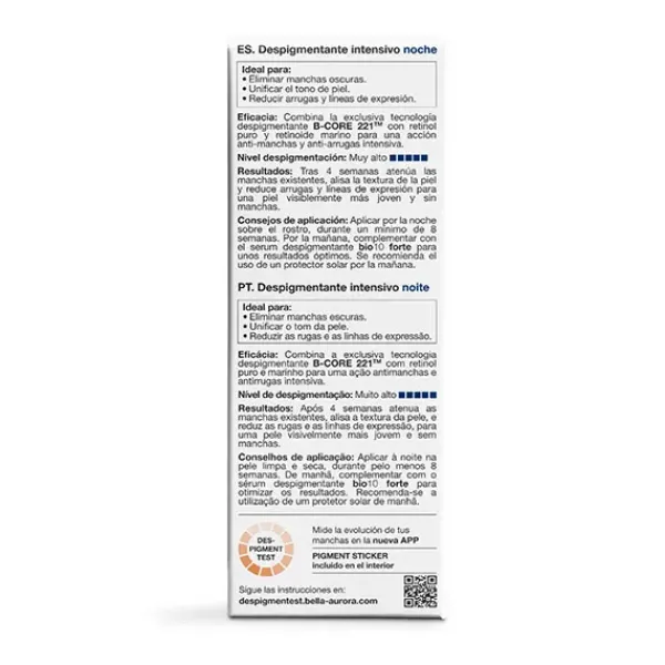 Eficacia: Combina la exclusiva tecnología despigmentante B-CORE 221™ con retinol puro y retinoide marino para una acción anti-manchas y anti-arrugas intensiva.