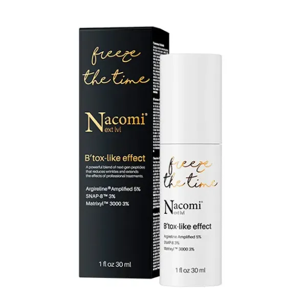 ¡Una atención innovadora que funciona de dos maneras! Nacomi Next Level B`tox-like effect es un suero peptídico antienvejecimiento que tiene efectos tanto preventivos como fortalecedores. Los péptidos avanzados de nueva generación que contiene no sólo demuestran efectos antienvejecimiento intensivos, sino que también prolongan los efectos de los tratamientos profesionales, como la toxina botulínica, ¡hasta 8 semanas! Suavizan eficazmente las arrugas faciales, tensan la piel y recuperan su firmeza juvenil. ¡No esperes que el tiempo deje su huella: elige un cuidado que siempre estará un paso por delante de las arrugas! La juventud no es cuestión de tiempo, sino de elegir la atención adecuada.
