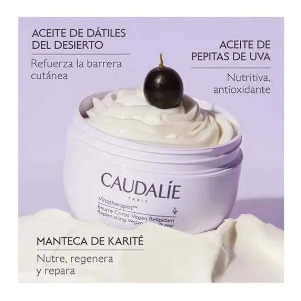 La Manteca Corporal Vegana Relipidante Vinotherapist™, antipicor y 100 % confort, nutre intensamente durante 24 horas y repara las pieles secas con tendencia atópica para un confort cutáneo duradero.