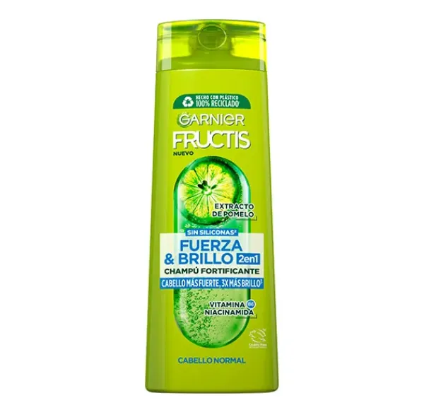 El champú fortificante Fuerza y Brillo de Fructis gracias a su fórmula con activos fortificantes de frutas, tonifica la fibra del pelo desde la raíz. Gracias a su fórmula compuesta por esencia de pomelo con vitaminas B3 y B6 consigue que tu pelo luzca más fuerte, brillante y fresco.