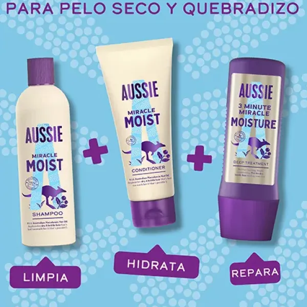 Prueba la colección Miracle Moist. Calma la sed de tu pelo con el Champú Hydrate de Aussie. El Champú hidratante de Aussie revitaliza completamente el pelo extremadamente seco. Con aceite de nuez de macadamia australiana, hidrata profundamente el pelo seco.