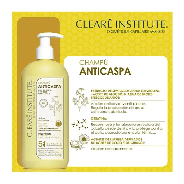 Clearé Institute Champú Anticaspa 400ml limpia suavemente eliminando la caspa, el exceso de grasa y calmando los picores.