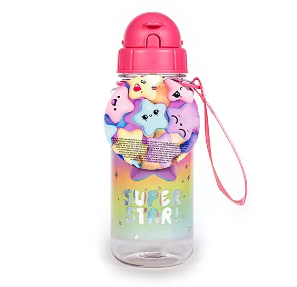 Botella de agua con bastón y asa. Estampado de súper estrellas. Etiqueta de estrella Etiqueta de arco iris. lámina holográfica