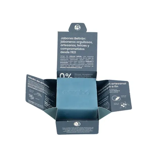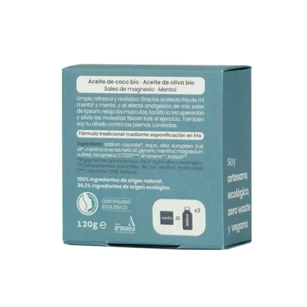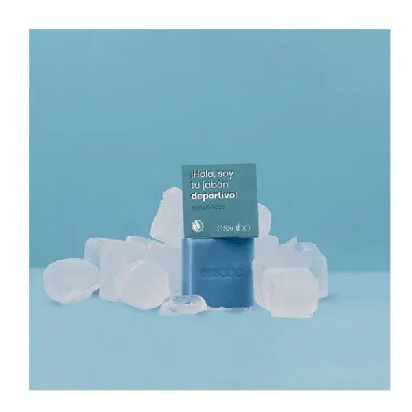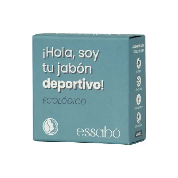 Essabó Deportivo es un jabón cosmético de baño que limpia, refresca y ayuda a la recuperación muscular tras el ejercicio. Gracias al efecto frío procedente del mentol y al efecto analgésico de las sales de magnesio, relaja los músculos y alivia las molestias físicas tras el ejercicio. Su base está elaborada con aceite de coco de agricultura sostenible y aceite de oliva procedente de cultivos bio españoles. Elaborado artesanalmente mediante saponificación tradicional en frío. Idóneo para su uso tras una sesión de deporte.