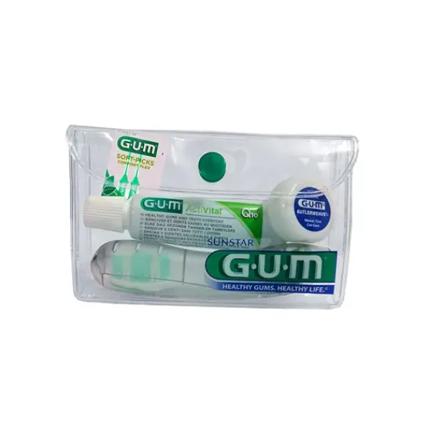 Ideal para los desplazamientos, contiene un cepillo de dientes plegable GUM TRAVEL con filamentos con protección antibacteriana* para garantizar la higiene de viaje; pasta de dientes GUM ActiVital® para unos dientes y encías sanos; hilo dental GUM BUTLERWEAVE®: un hilo dental resistente al deshilachado; y 2 GUM SOFT-PICKS® COMFORT FLEX MINT: estos palillos de goma desechables eliminan la placa interdental de forma suave y segura y tienen un agradable sabor a menta fresca.
