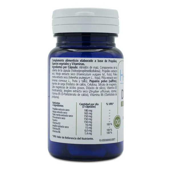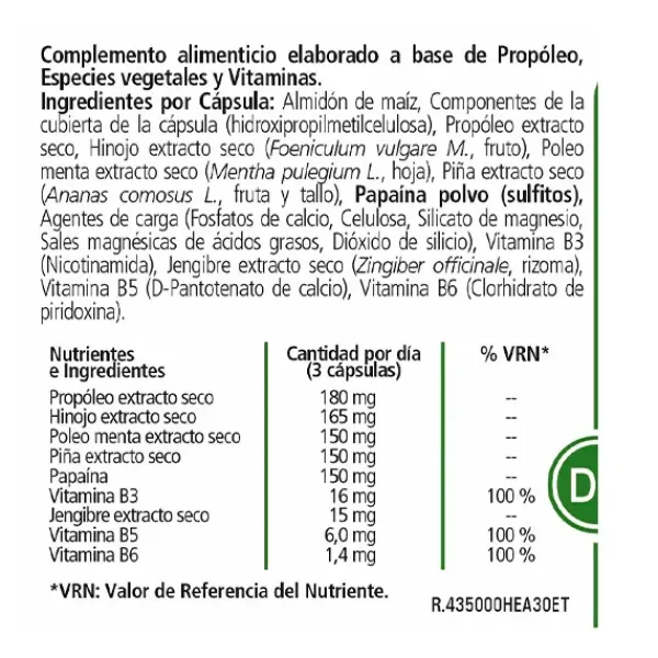 Complemento alimenticio elaborado a base de propóleo, especies vegetales y vitaminas.