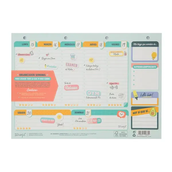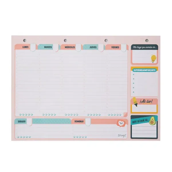 Planificador de organización semanal, apaisado y con tapa dura y encuadernación en espiral.