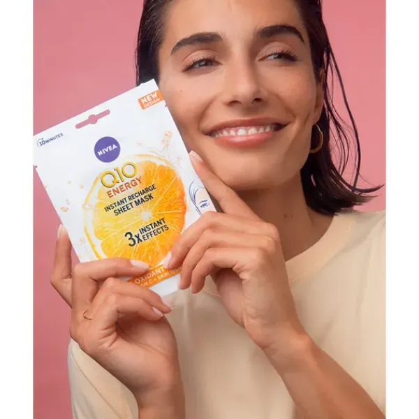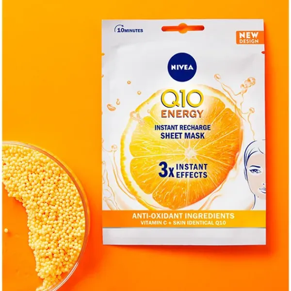 La mascarilla de tejido NIVEA Q10 ENERGY Tissue Mask Antiarrugas, infusionada con coenzima Q10 y Vitamina C, recarga de inmediato la piel cansada y apagada, proporcionándole una dosis extra de energía. Su fórmula contiene coenzima Q10 idéntica a la de la piel y vitamina C, una poderosa combinación de dos eficaces antioxidantes que ofrece 3 efectos instantáneos: reduce los signos de fatiga, suaviza las arrugas y líneas de expresión y nutre la piel. La mascarilla de tejido está impregnada con una dosis equivalente a medio envase de sérum de coenzima Q10 y vitamina C*, para que tu piel luzca fresca, radiante, luminosa y suave en tan solo 10 minutos. Relájate y deja que esta agradable mascarilla proporcione a tu piel la dosis extra de energía que necesita. Puedes utilizar hasta dos mascarillas por semana y si quieres aportar un extra de frescor a tu rostro, enfríala en el frigorífico antes de su uso.