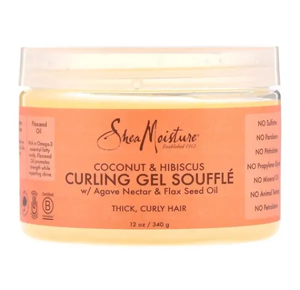 El SheaMoisture coco y Hibiscus Curling Gel Soufflé para el cabello rizado o afro define y promueve rizos con un acabado suave. Ayuda a dar un estilismo totalmente natural, hidratando y acondicionando, dejando el cabello libre de frizz y brillante.