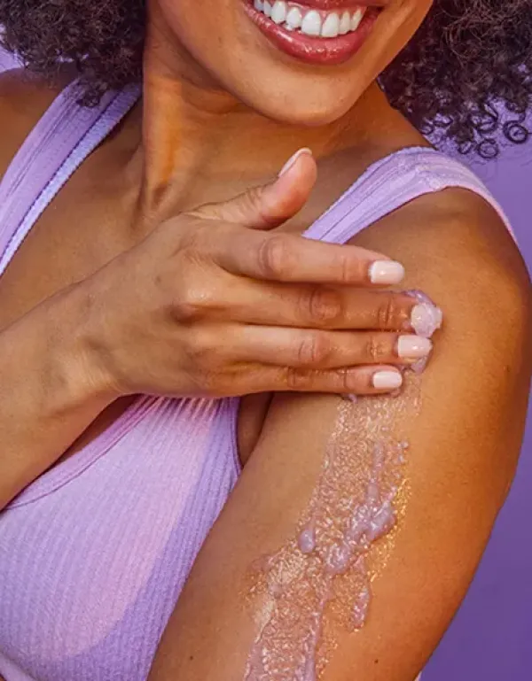 Elaborado con azúcar, manteca de karité, champiñones de nieve, magnesio, amatista en polvo y una variedad de aceites naturales como aceites de onagra, aguacate, macadamia, almendras dulces, cártamo y naranja para dejar la piel con una buena sensación y un olor delicioso.