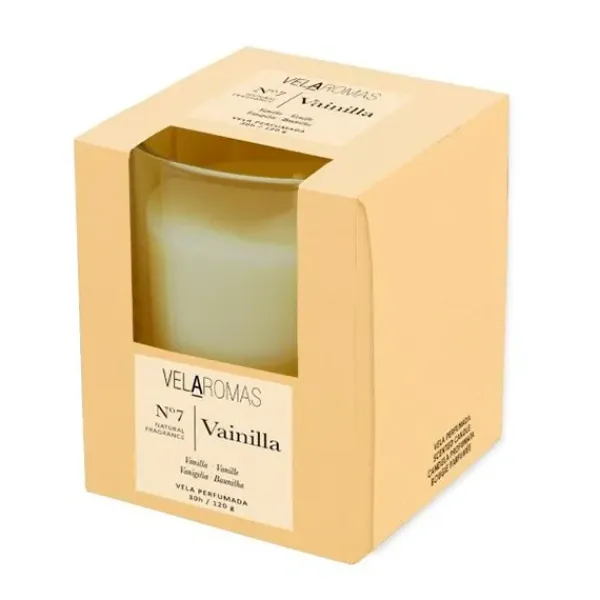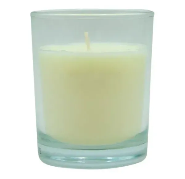 Vela de cera vegetal con fragancia Vainilla. Presentada en vaso de cristal 100% reciclable.