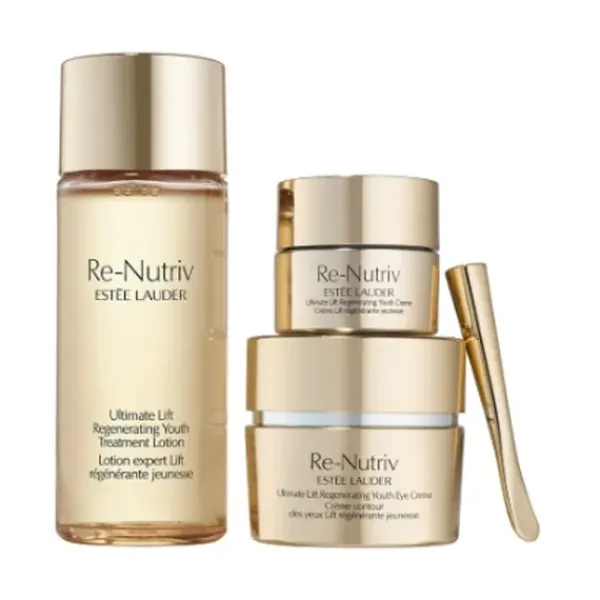 En el corazón de los productos Ultimate Lift Regenerating Youth se encuentra nuestro valioso extracto de genciana, que se obtiene de una flor única originaria de las montañas del Himalaya. Inspirándose en su poder de autorrenovación, Re-Nutriv extrae sus energías ocultas y concentra una «molécula de supervivencia» de la planta. Estas poderosas fórmulas trabajan juntas para revelar un resplandor vital y juvenil. La loción de tratamiento Re-Nutriv hidrata y le da a la piel una apariencia radiante con una pureza mejorada. Prepara la piel para los productos de cuidado posteriores. La crema facial Re-Nutriv aporta a la piel una hidratación regeneradora y la mima con una sensación agradable. La piel luce tonificada, se siente más firme y está fortalecida para resistir futuros signos de envejecimiento. La crema para ojos Re-Nutriv, ligera como una pluma, hidrata la zona de los ojos. El área de los ojos se ilumina, se ve menos hinchada, parece tersa y se siente más firme. Las arrugas debajo de los ojos aparecen reducidas.
