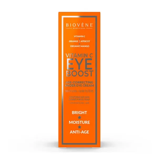 Tratamiento contorno de ojos EYE BOOST hidratante de día y noche corrector de edad para el rejuvenecimiento de la piel debajo de los ojos con vitamina C y mango orgánico que ayuda a minimizar la aparición de ojeras, líneas finas y refresca la piel cansada.