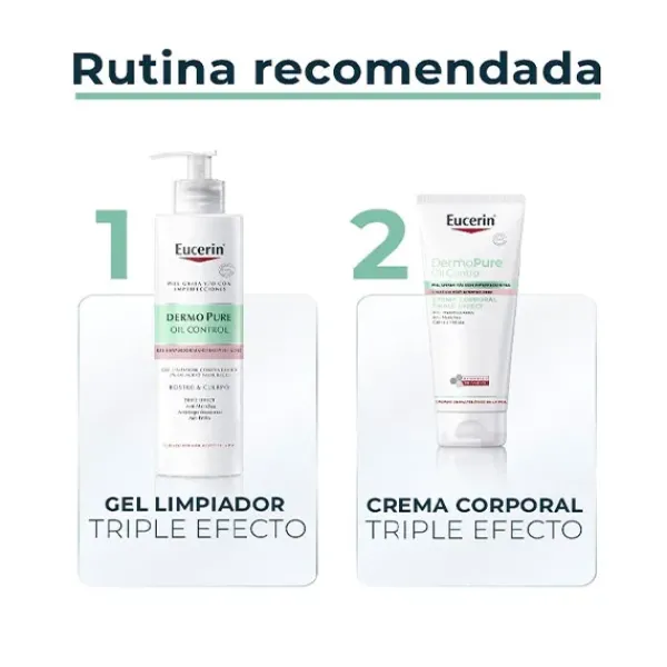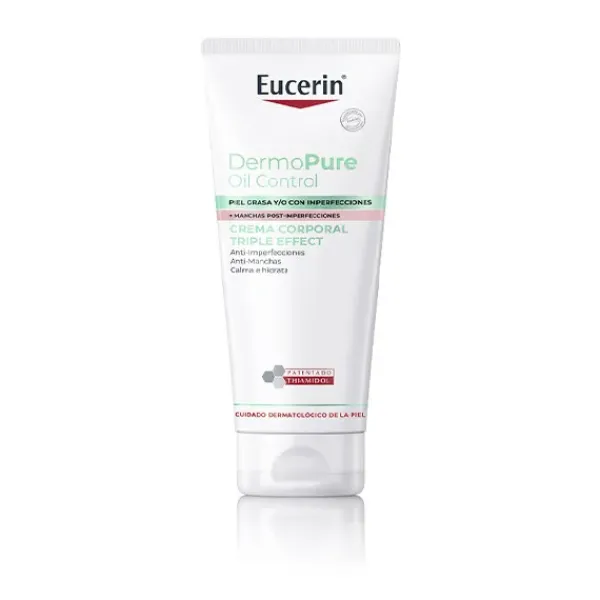 DermoPure Crema Corporal Triple Efecto de Eucerin combina ingredientes activos eficaces para reducir finalmente las imperfecciones y las manchas de acné mientras calma e hidrata la piel: