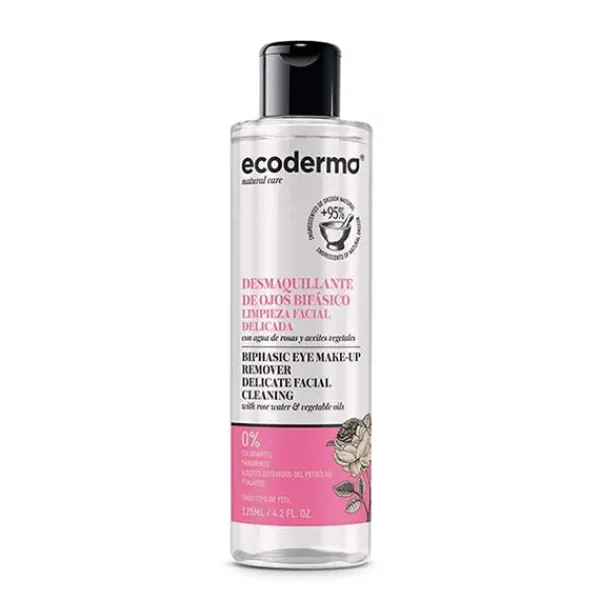 El Desmaquillante de Ojos Bifásico de Ecoderma, está elaborado con ingredientes de origen natural respetuosos con la piel y el medio ambiente. Su fórmula, con Agua de Rosas y Aceites de Almendras, elimina con delicadeza cualquier tipo de restos de maquillaje en párpados y pestañas.