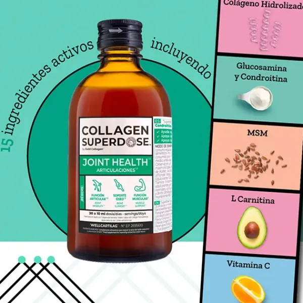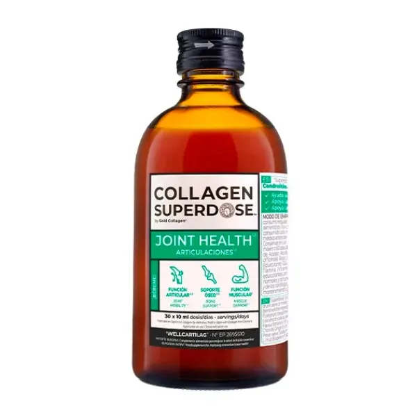Collagen Superdose Joint Health 300 ml. Complemento alimenticio bebible a base de péptidos de colágeno líquido que ayuda a mantener el funcionamiento normal de las articulaciones, huesos y músculos. Sabor multifrutas. Indicado para adultos. Tratamiento de un mes.