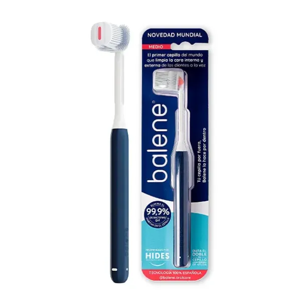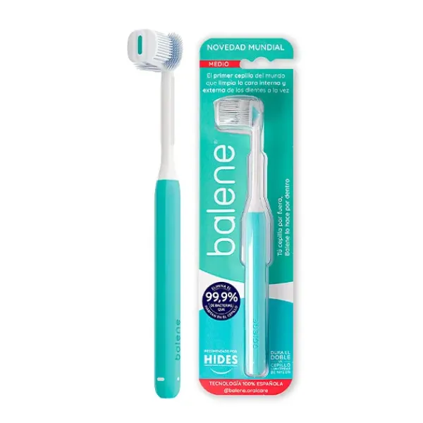 Balene es el primer cepillo del mundo que limpia la cara interna, externa y superficie de masticado de los dientes a la vez. Sus cerdas tyflex de nueva generación eliminan el 99,9% de las bacterias que habitan en el cepillo y duran el doble vs las cerdas de nylon.